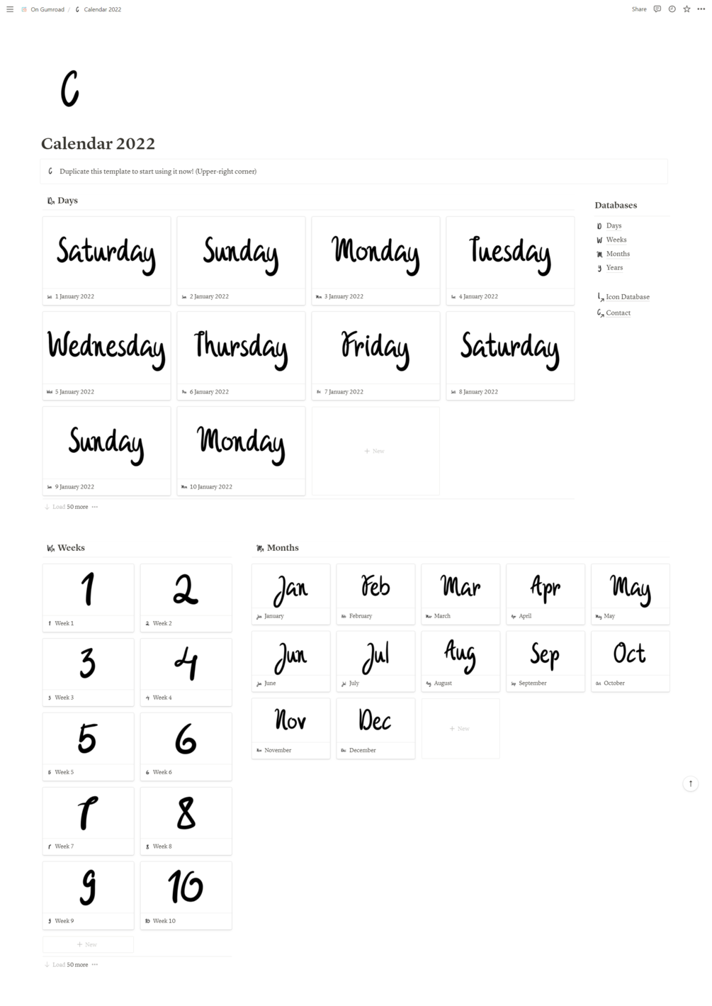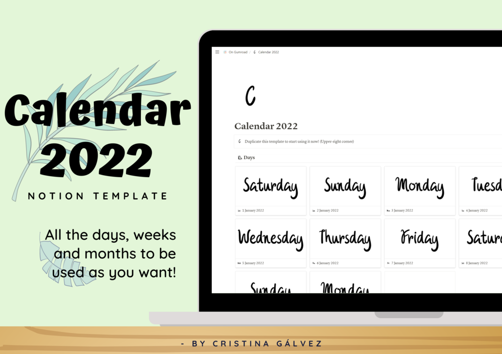 Get the Notion template with the Calendar for 2022. All days, weeks, months and year are already filled with all the useful information you would need.