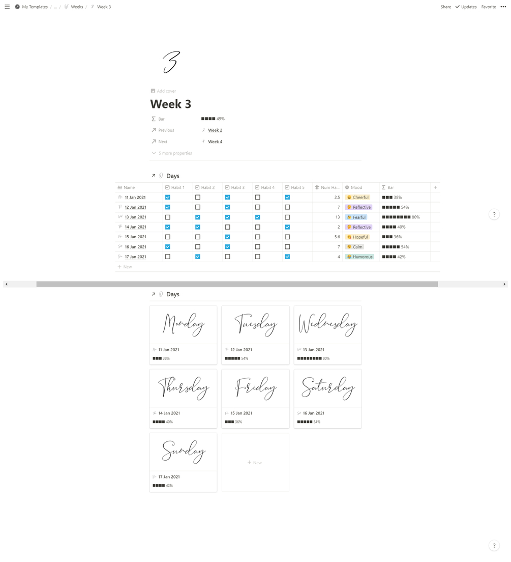 It includes all the 365 days of 2021 already set with icons, next-previous relations, and relate to the week, month and year databases. Week, Month and Year databases also include already filled relevant information and even some layout templates to display the Day database on them.